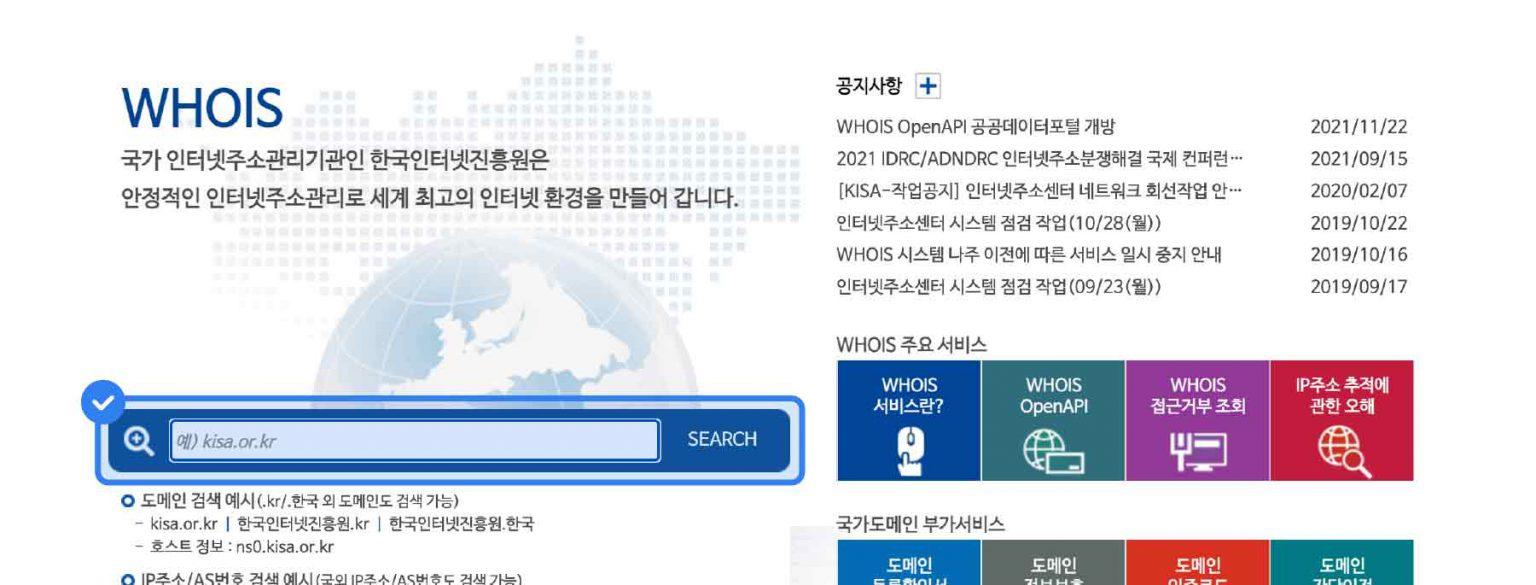 ▲ 후이즈(whois) – 한국인터넷진흥원에서 운영하는 사이트로 도메인 등록이 가능한 지 확인할 수 있어요.