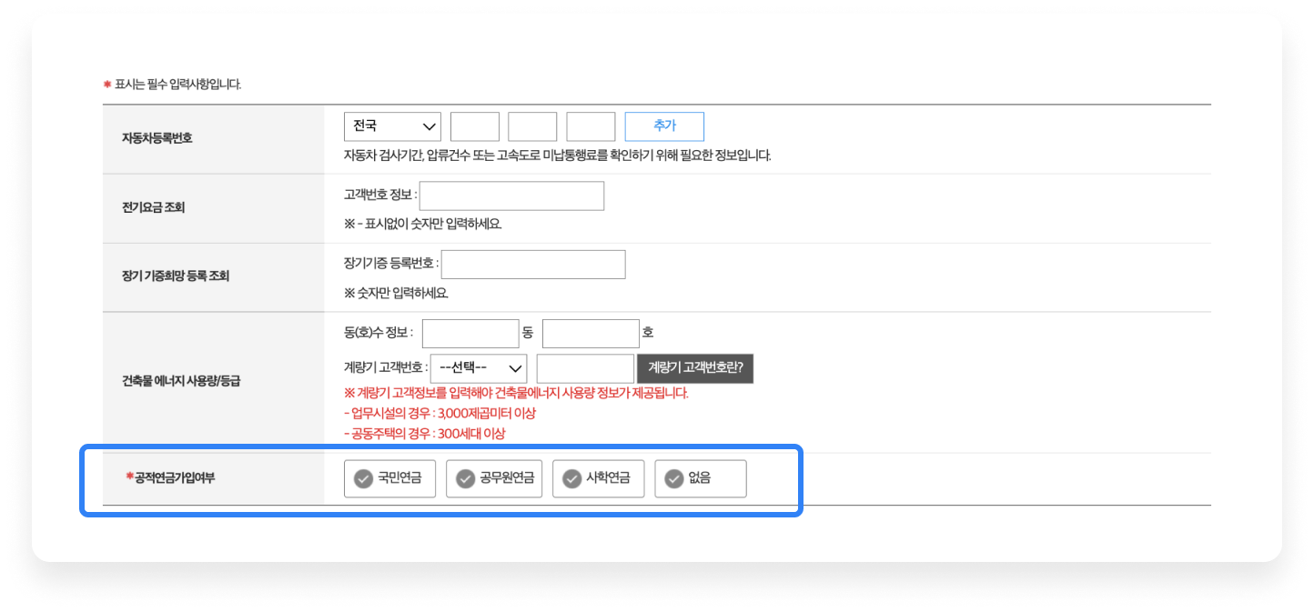 ‘공적연금가입여부’는 필수적으로 입력해 주세요. 나머지 정보는 입력하지 않아도 가입할 수 있어요.