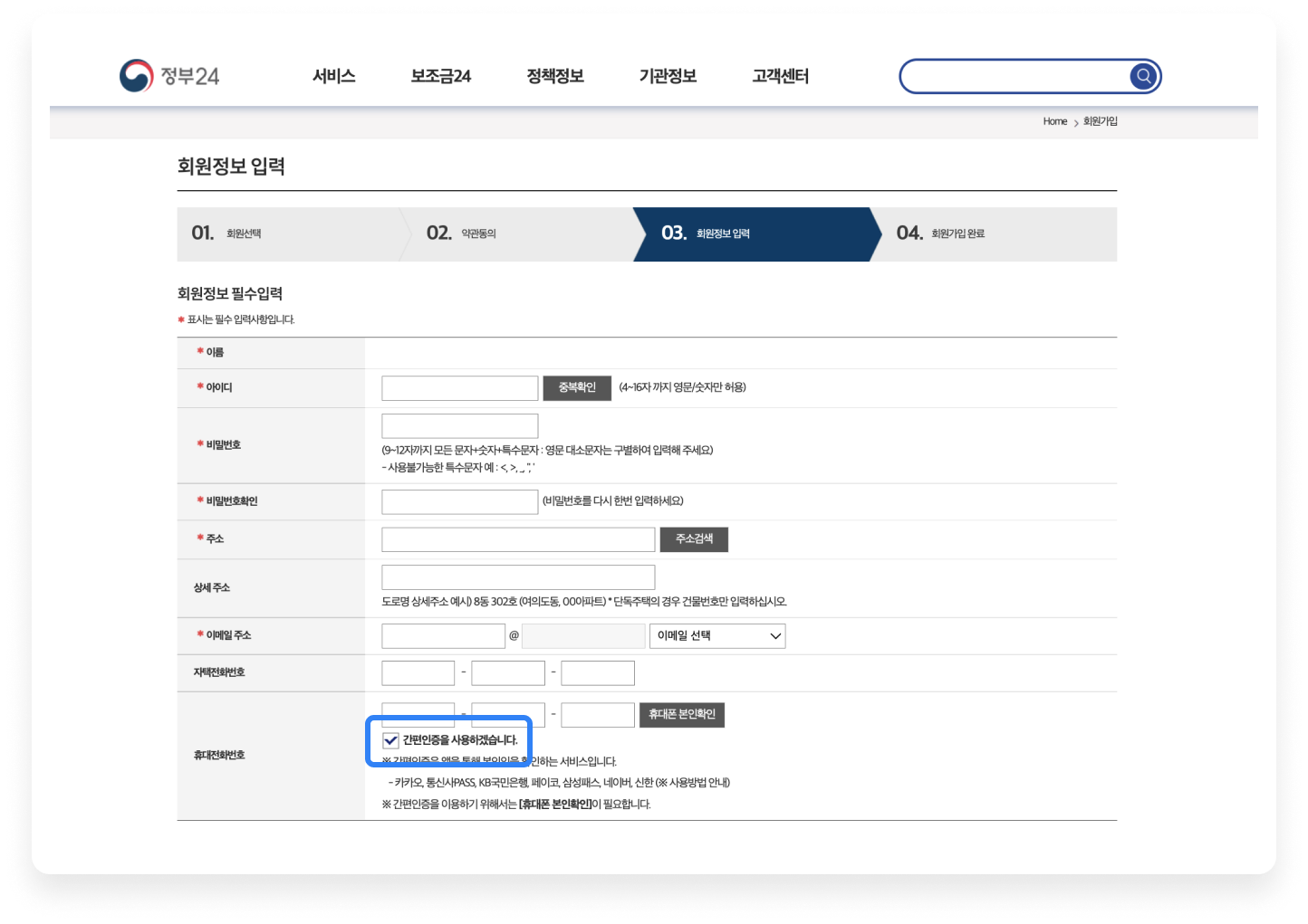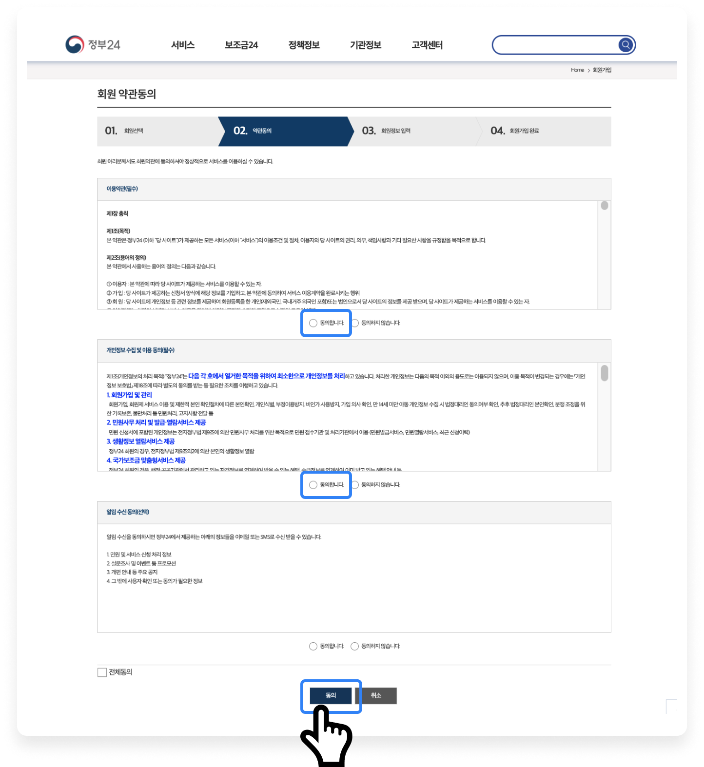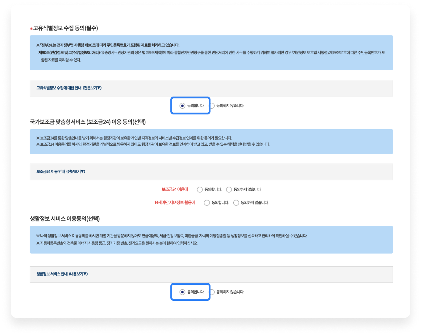 가입을 위해 반드시 동의해야 하는 항목에 ‘동의합니다’를 체크해 주세요. 생활정보 서비스 이용동의는 ‘선택사항’이지만, 공적연금 가입 여부에 따라서 필수 동의 항목이 될 수 있어요.