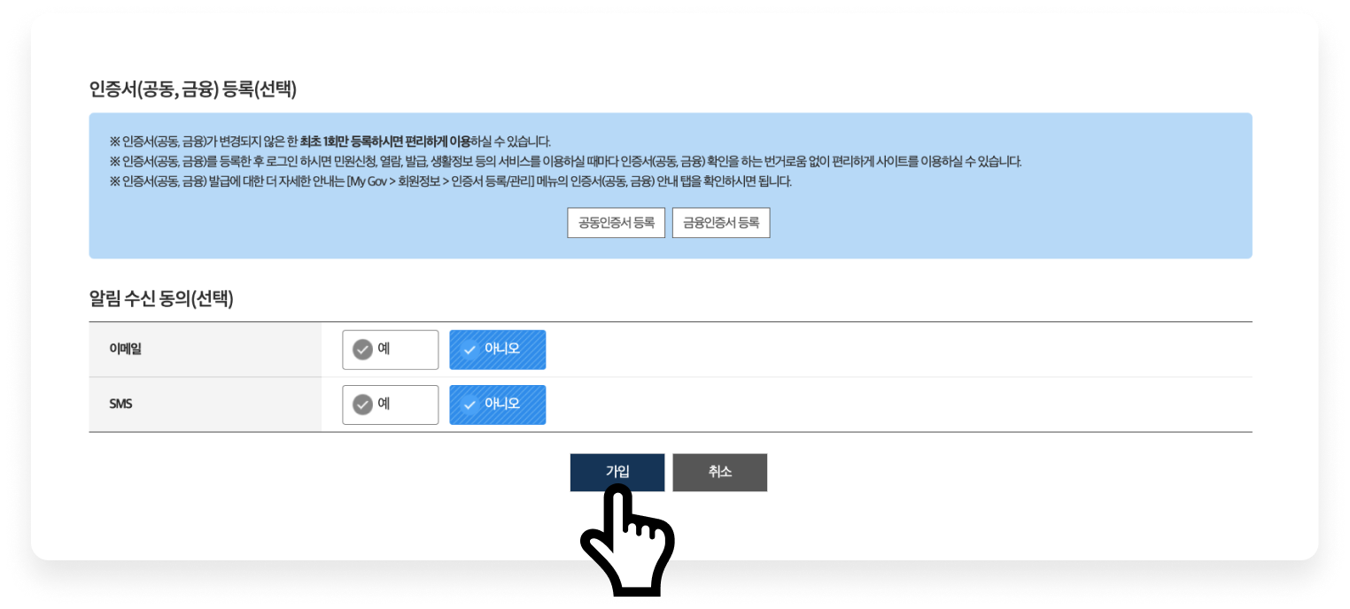 필수 항목은 아니지만, 공동, 금융 인증서를 등록하면 정부24를 더 편하게 이용할 수 있어요. 정부24의 알림을 받을 것인지도 선택할 수 있어요.