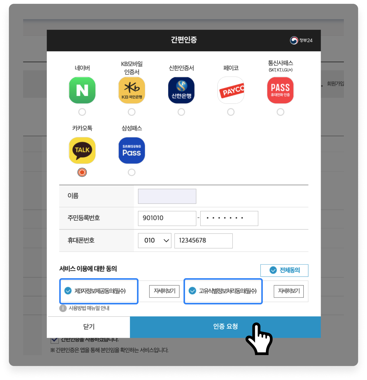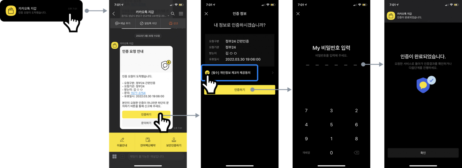 선택한 인증수단으로 인증요청이 왔는지 확인하고, 인증을 완료해 주세요. 아래 이미지는 ‘카카오톡’을 인증수단으로 선택했을 때 인증하는 방법이에요. 본인에게 편하고 익숙한 방법으로 인증하시면 돼요.