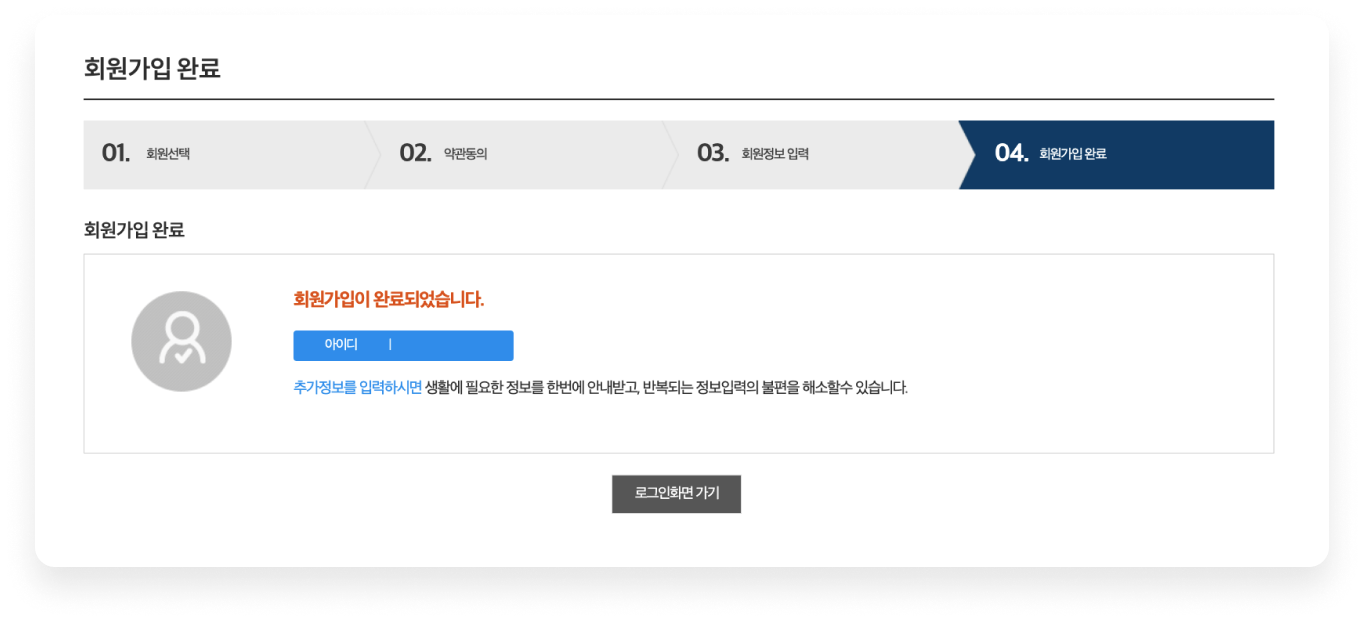가입 버튼을 누르면 가입 완료 메시지를 확인할 수 있어요. 로그인화면 가기 버튼을 누르면 정부24 서비스를 이용해 다양한 민원 업무를 처리할 수 있어요.