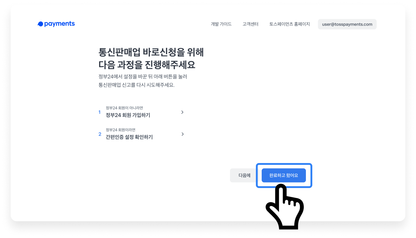✅ 토스페이먼츠 ‘통신판매업 바로신청’ 과정 중에 정부24 가입을 하신 분이라면, 통신판매업 바로신청 화면으로 돌아가 주세요.