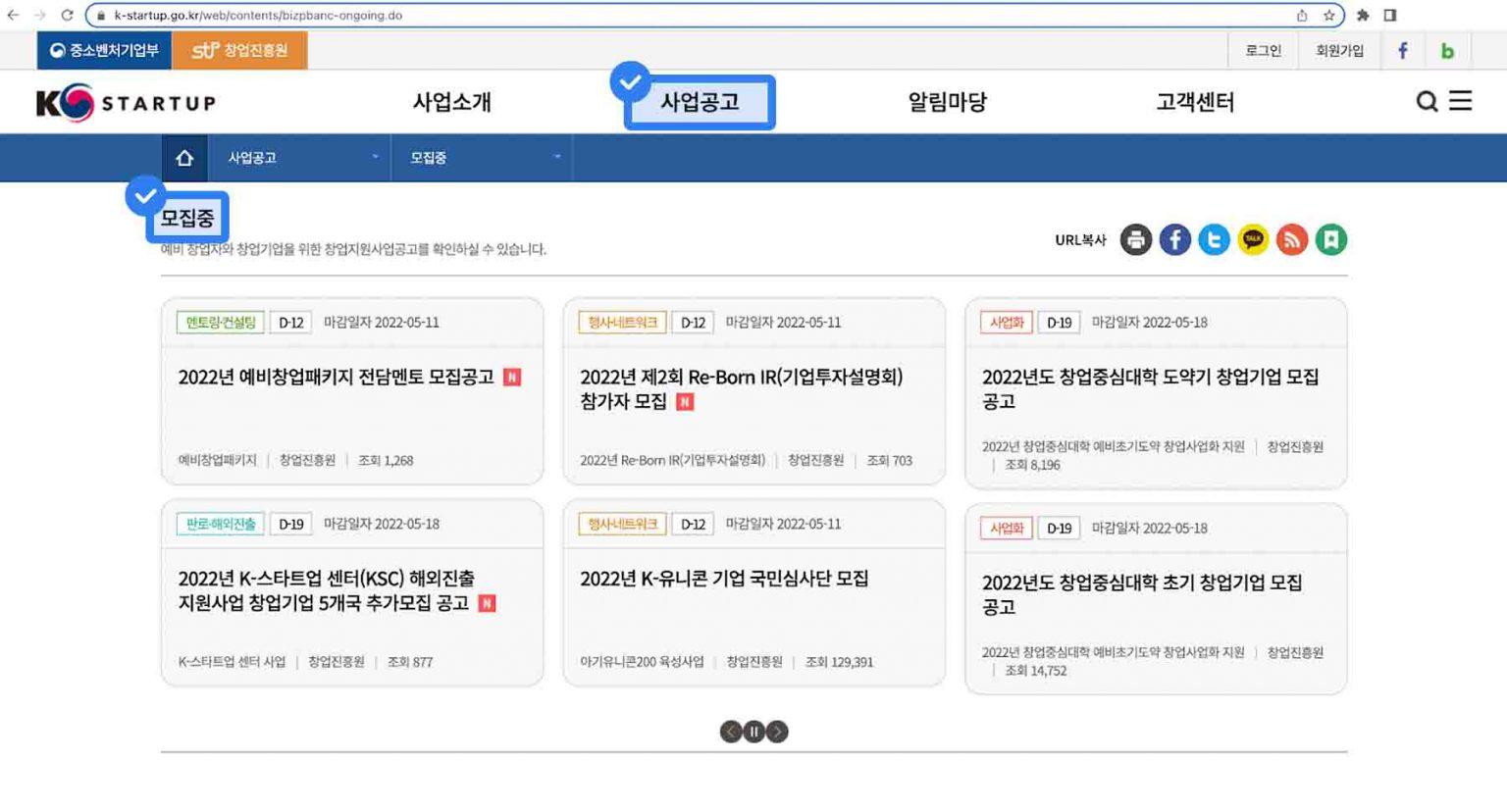 창업지원금 공고 확인하는 방법 : K-startup 창업지원 포털 접속 > 사업공고 > 모집중
