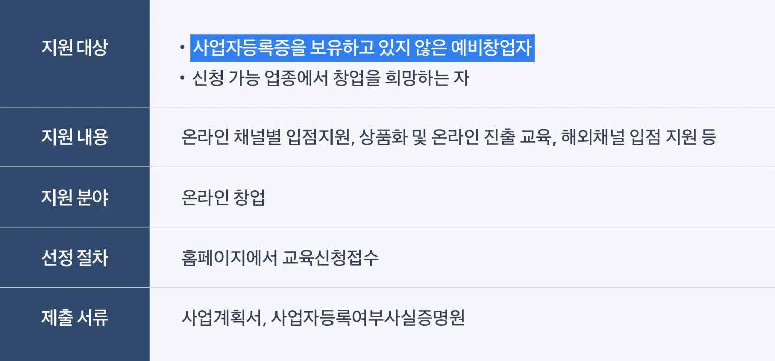 쇼핑몰 창업을 고민 중이라면 소상공인시장진흥공단에서 주관하는 커머스 창업 지원 프로그램에 지원해 보세요. 원래 오프라인 창업 중심의 실습 프로그램을 운영했다가 코로나 이후 온라인 플랫폼 비즈니스에 특화된 판매 교육, 마케팅, 홍보 관련 지원을 하고 있어요.