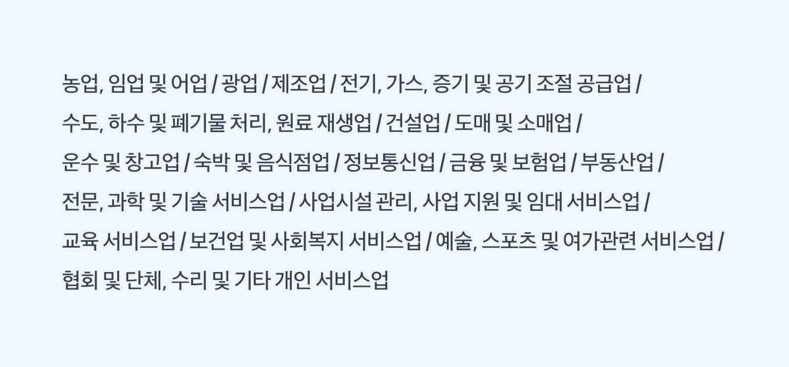 ✔️ 신사업 창업 사관학교 지원 가능한 업종은? 한국표준산업분류표 기준으로 다음 업종으로 분류된 업종만 신청할 수 있어요.