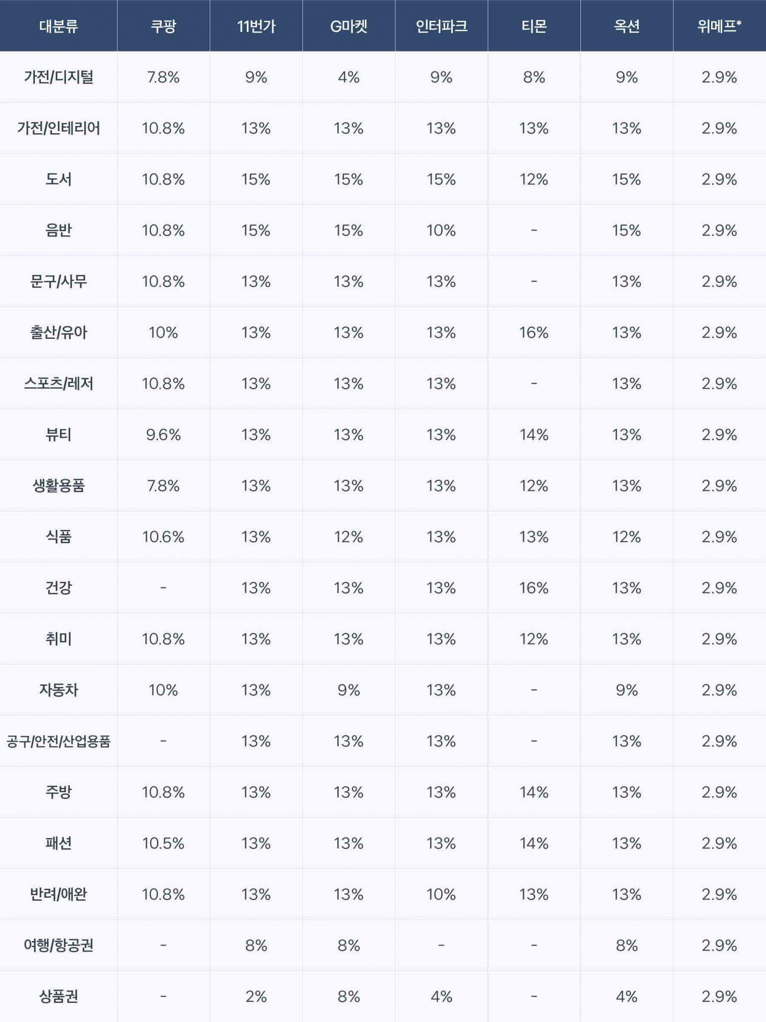 ※ 아래 내용은 오픈마켓 브랜드 평판 2022년 4월 분석 결과 상위 7개 오픈마켓의 상품 카테고리별 수수료율을 비교한 표에요.