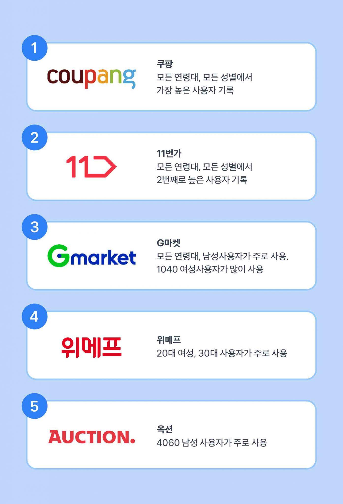 쿠팡(총 2,503만 6,170명) > 11번가 (총 965만 4,597명) > G마켓 (총 630만 287명) > 위메프 (총 526만 2,084명) > 티몬 (총 468만 9,758명) > 옥션 (총 325만 546명)