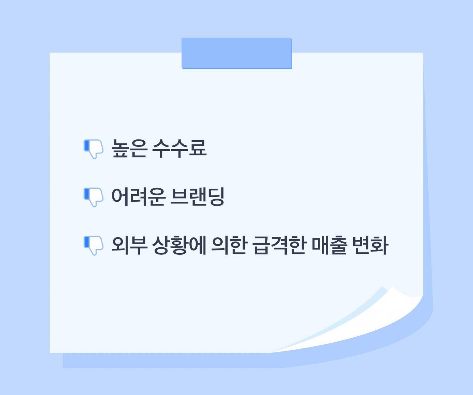 - 진입장벽이 낮은 만큼 가격 경쟁이 치열해요. 판매할 때마다 수수료를 내야 하는데, 상품 마진율을 미리 계산해 보지 않으면 상품을 팔수록 손해 볼 수 있어요.