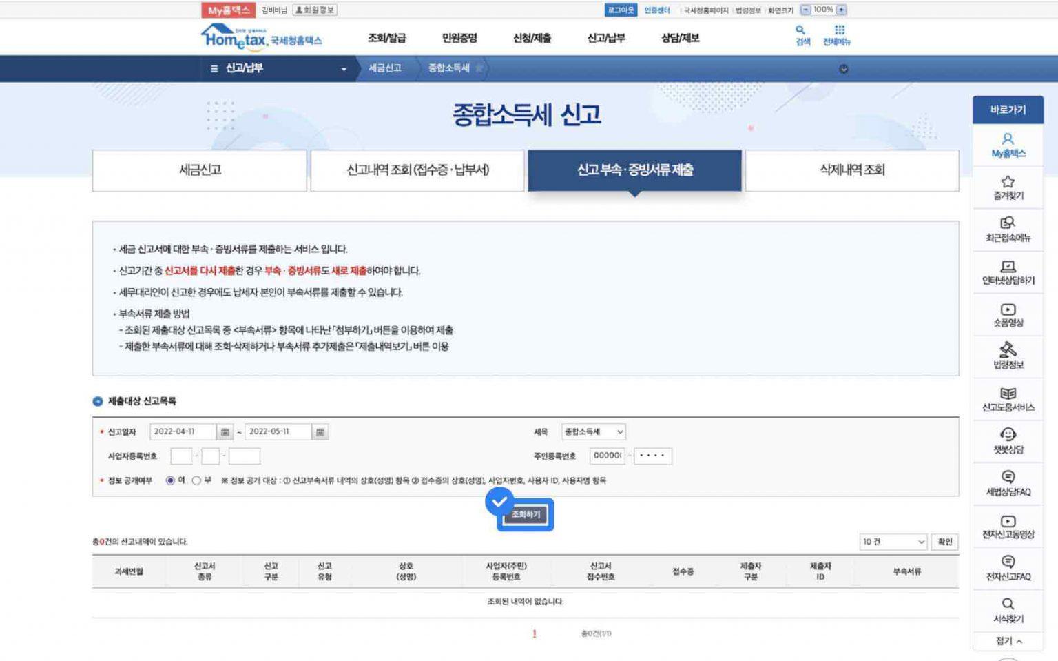 step 8. 제출대상 신고목록에서 ‘조회하기’ 버튼 클릭 ‘조회하기’ 버튼을 클릭하면, 신고 내역 목록이 나타나요. 여기에 부속서류를 첨부할 수 있는 버튼이 있어요.