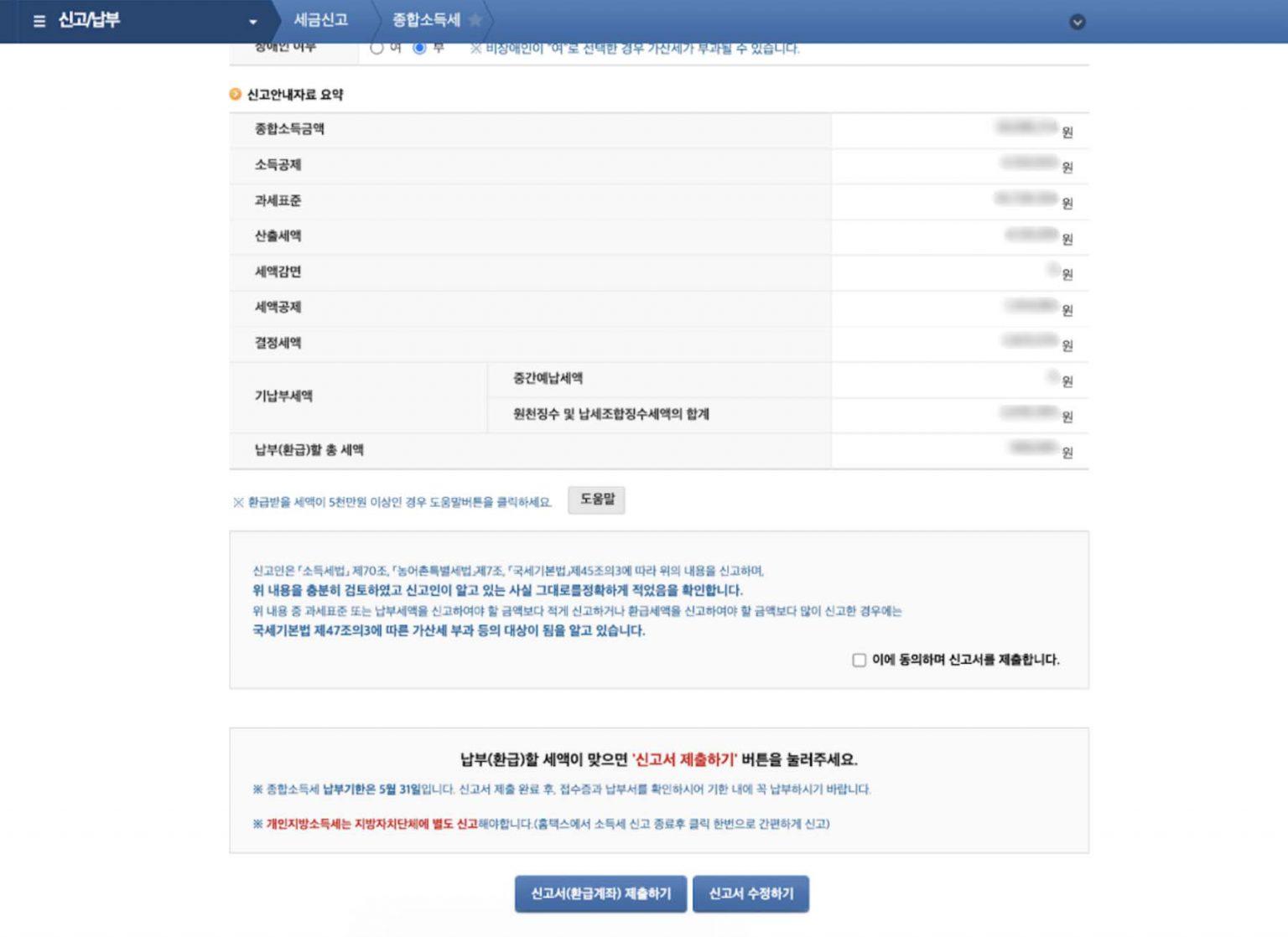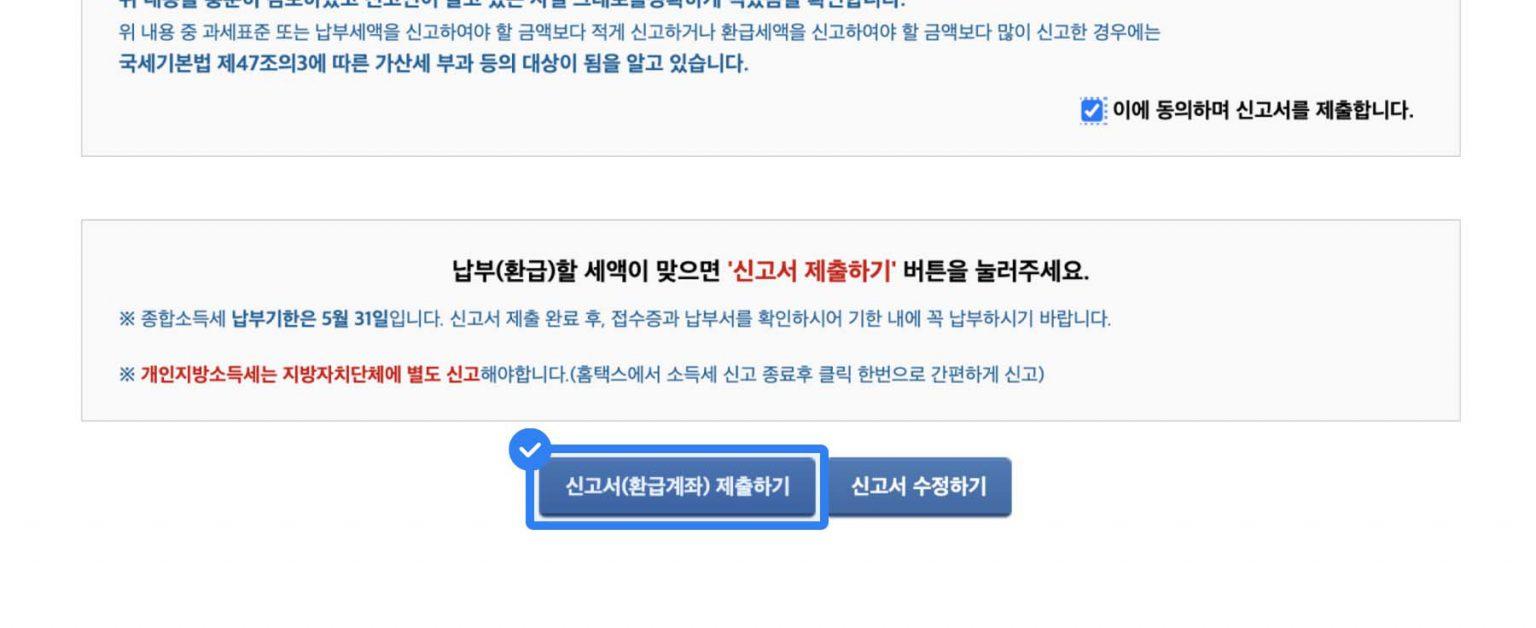step 5. ‘이에 동의하여 신고서를 제출합니다’ 체크 후 ‘신고서(환급계좌) 제출하기’ 버튼 클릭