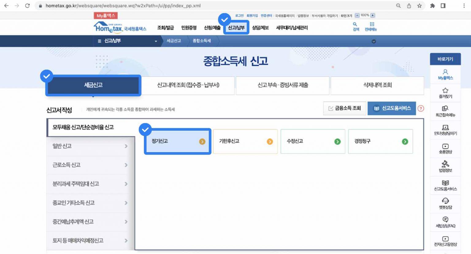step 1. 홈택스 [신고/납부] – [세금신고: 종합소득세] – [세금신고] – [정기신고]에 접속하기