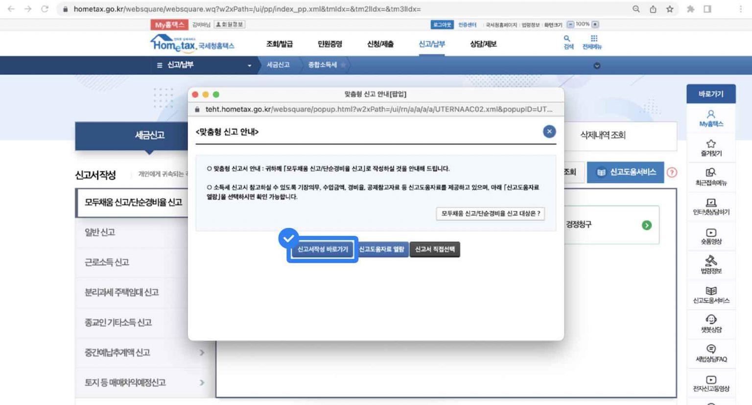 step 2. 맞춤형 신고 안내 팝업이 뜨면 ‘신고서작성 바로가기’ 버튼 클릭