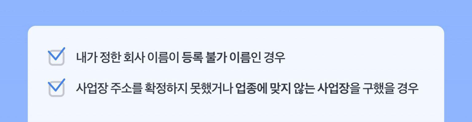 물론 이 모든 것은 사업자등록 후 변경할 수 있어요. 하지만 미리 정한 회사 이름이 등록 조건을 맞추지 못했거나, 업종 형태에 부합하지 않는 사업장 형태일 경우 사업자등록이 반려될 수 있어요.