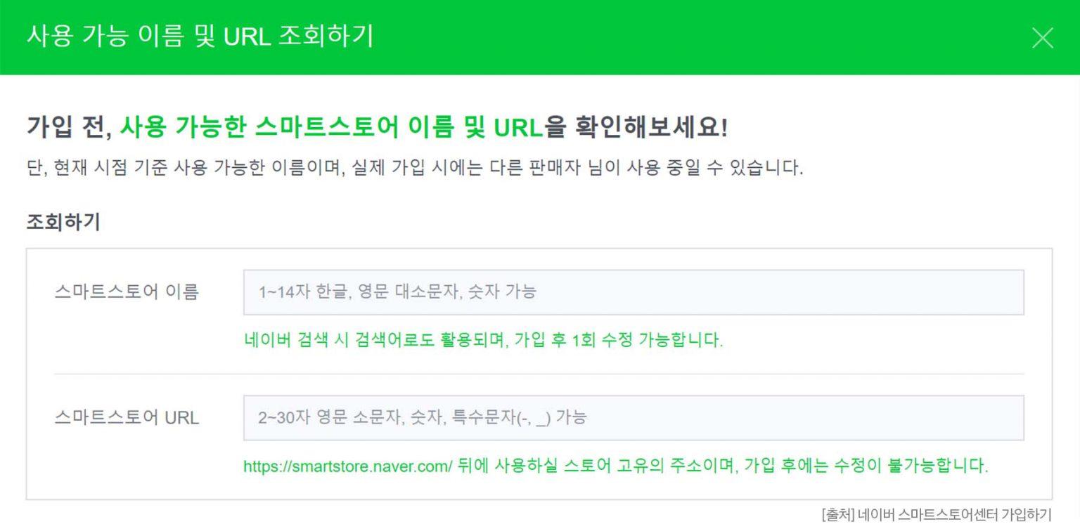다른 사람이 이미 사용한 스마트스토어 이름은 사용이 불가능해요. 스마트스토어 가입할 때 사용 가능한 이름과 URL을 검색할 수 있으니 해당 기능을 활용해 사장님만의 스토어 이름을 등록해 보세요.