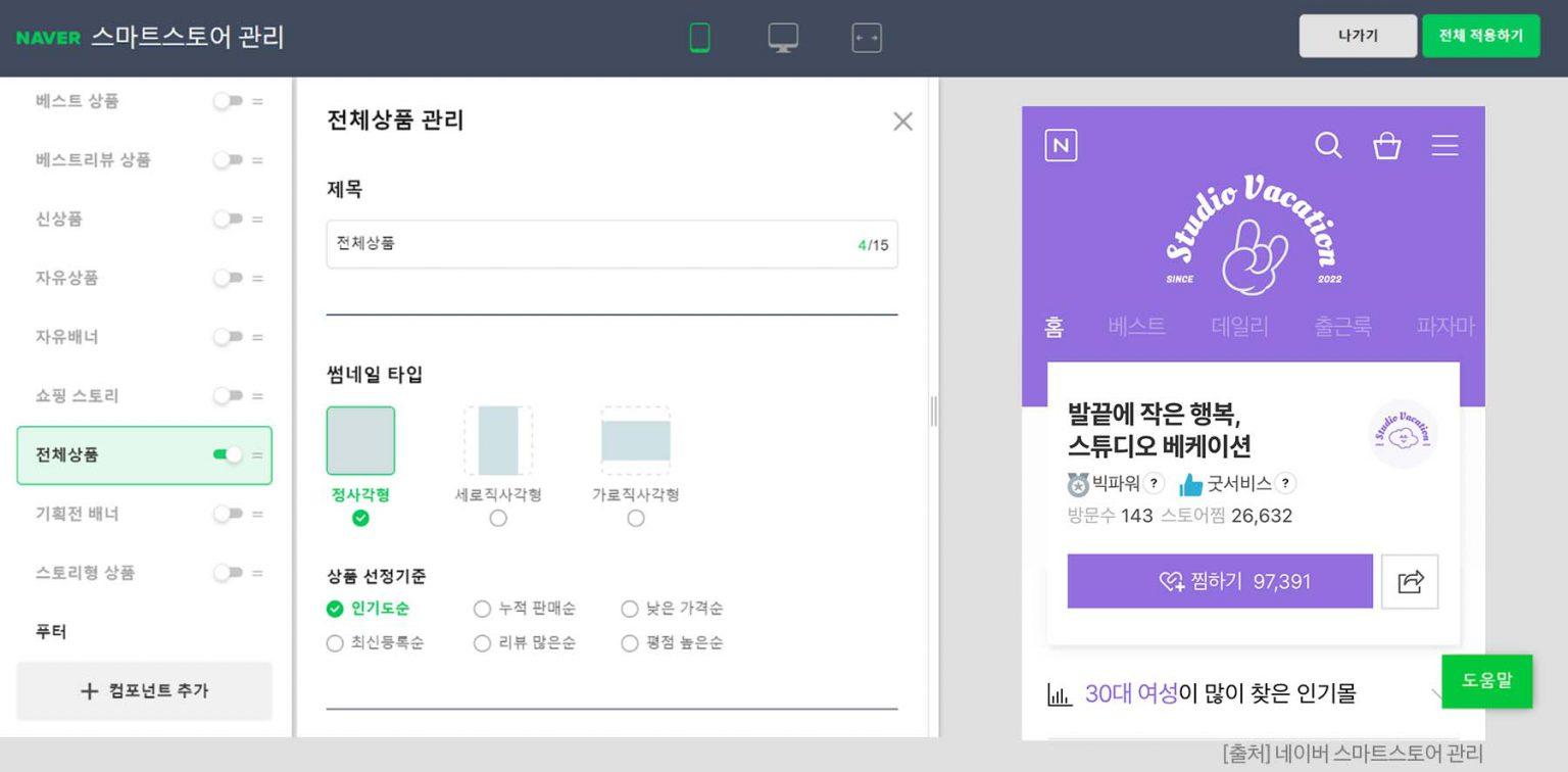 스마트스토어로 쉽고 간단하게 일정 수준 이상의 쇼핑몰을 만들 순 있지만, 세부적인 디자인 구현에는 한계가 있어요.
