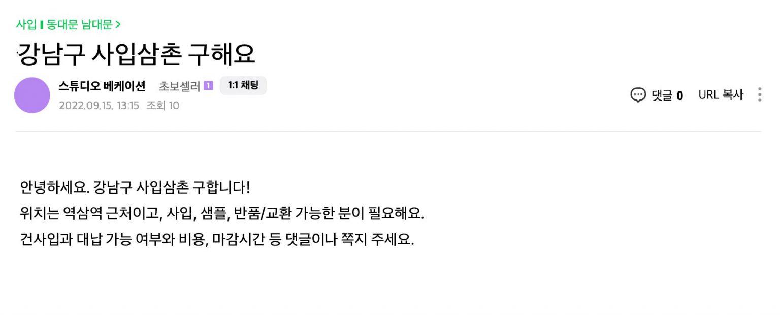 사입삼촌을 구하는 게시판에 사장님이 사는 지역, 원하는 조건 등을 포함해 글을 쓰면 댓글이나 쪽지로 사입삼촌의 연락을 받을 수 있어요. 이야기를 나눠보고 합리적 비용과 조건을 제안하는 사입삼촌과 계약하면 돼요.