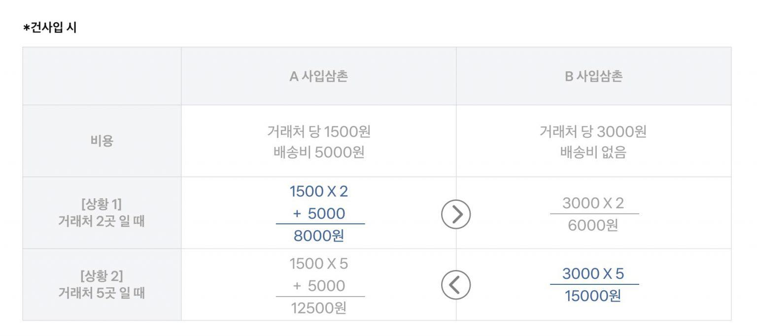 반면 사장님이 거래하는 도매업체가 5곳이라면 B사입삼촌에게 지급할 금액은 1만5천원, A사입삼촌에게 지급할 금액은 1만2천5백원으로 A사입삼촌과 계약하는 게 더 저렴해요.