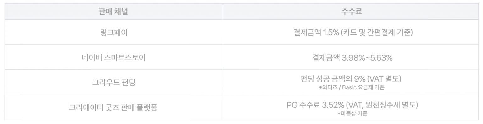 - 굿즈 판매 채널을 선택할 때에는 크리에이터 특성, 구매 접근성, 채널 수수료를 꼼꼼히 살펴야 해요.