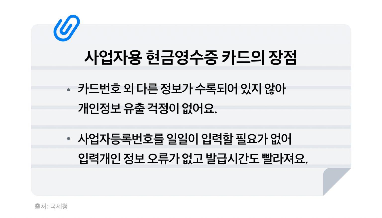 - 사업자용 현금영수증 카드를 사용하면 현금영수증을 발급받을 때 매번 사업자 번호를 입력해야 하는 번거로움이 없어져요.