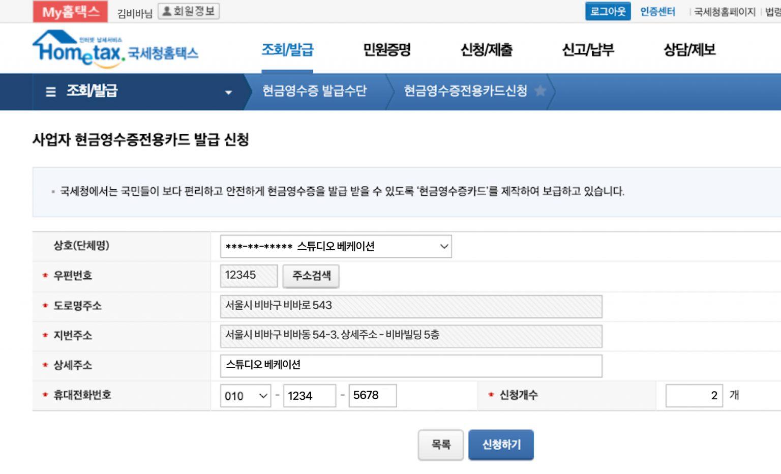 만약 사업자로 등록해둔 상호가 여러 개라면, 현금영수증을 발급받으려는 사업자에 맞게 상호를 설정해 주세요. 주소는 이전에 저장한 내용이 자동으로 입력되기 때문에 ‘휴대전화 번호’와 ‘신청 개수’만 추가로 입력하면 돼요. 필요한 카드 개수만큼 신청할 수 있어요.