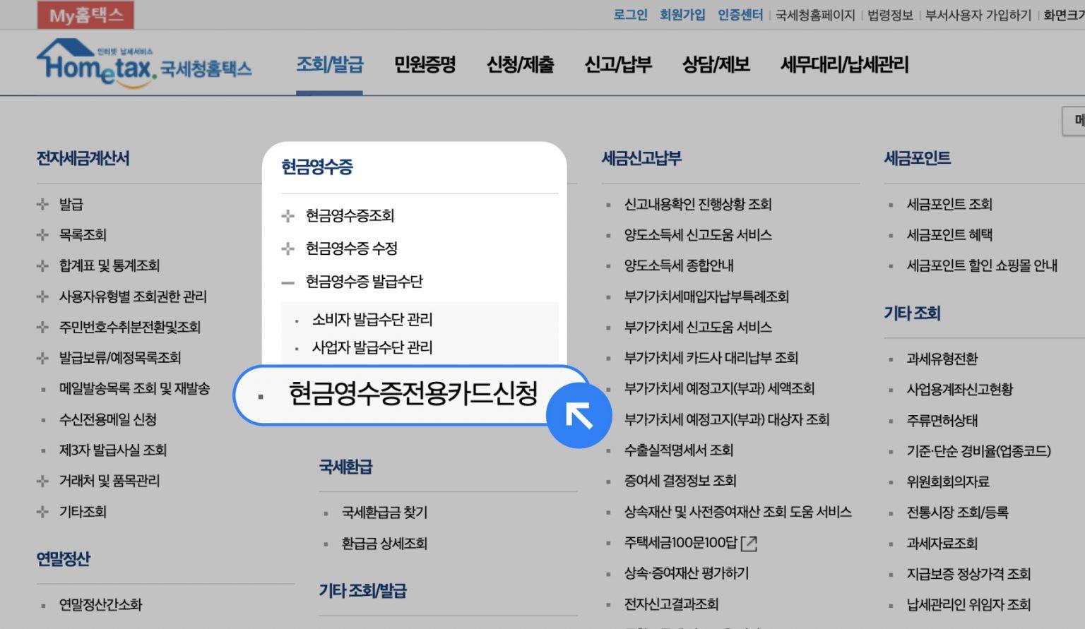step 2. 상단 [조회/발급] 메뉴 > [현금영수증] > [현금영수증 발급수단] > [현금영수증전용카드신청] 클릭하기