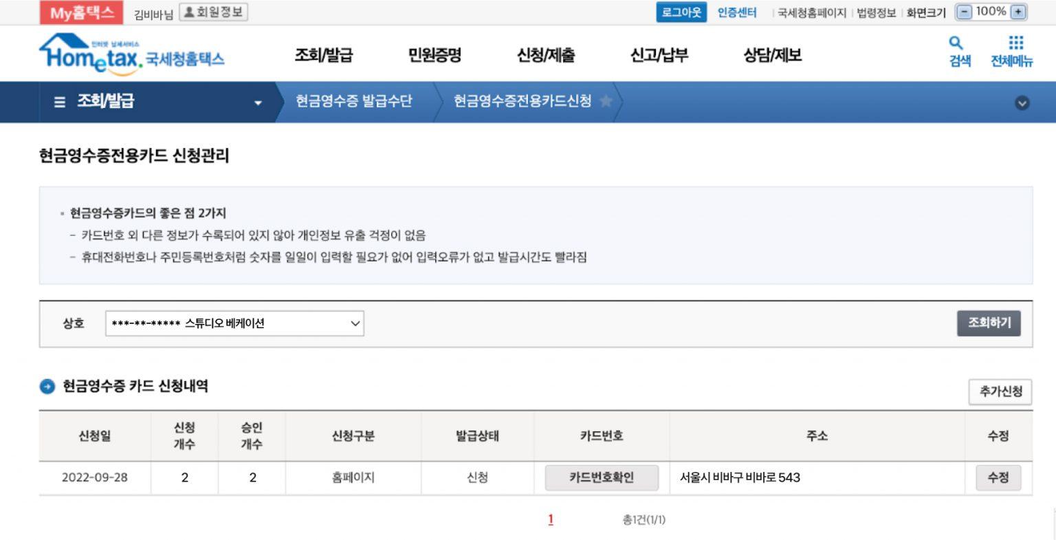 step 6. 신청 완료 후 [현금영수증 카드 신청내역]에서 확인하기