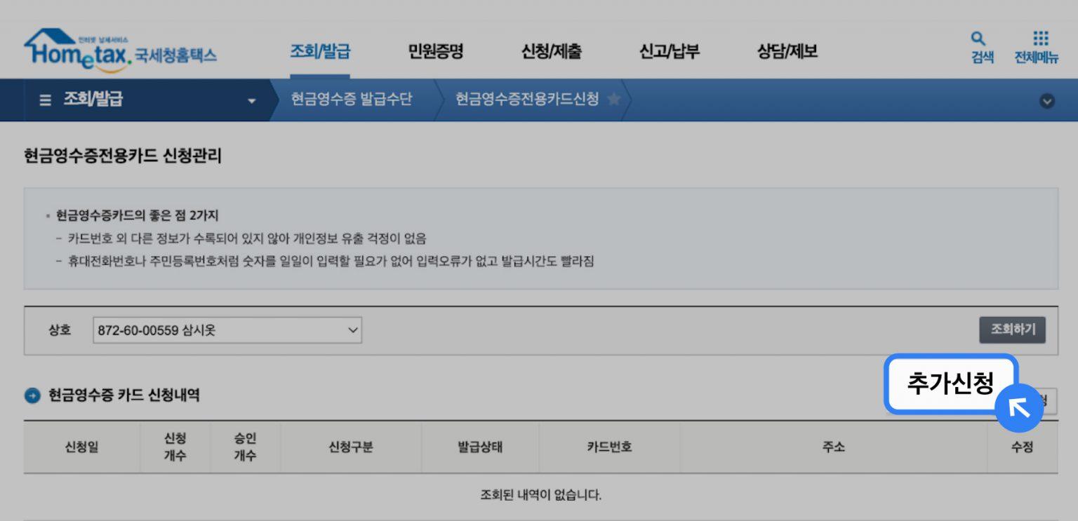 step 4. 현금영수증전용카드 신청관리 페이지 [추가신청] 버튼 클릭하기