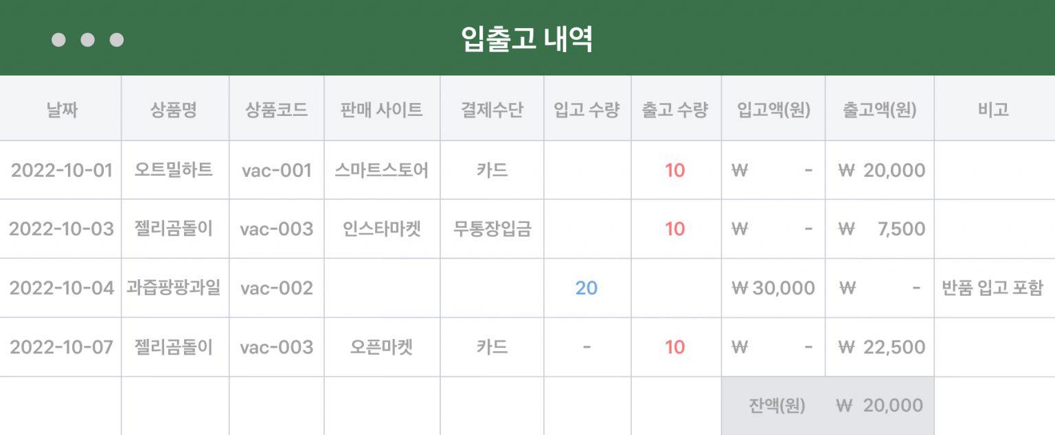 - ‘판매 사이트’, ‘결제 수단’에는 상품이 출고된 사이트와 수단을 적어주세요. 같은 상품이라도 사이트, 결제 수단이 다를 수 있는데요. 이를 정리해 두면 판매처별 입출고 현황을 한 눈에 볼 수 있어요.
