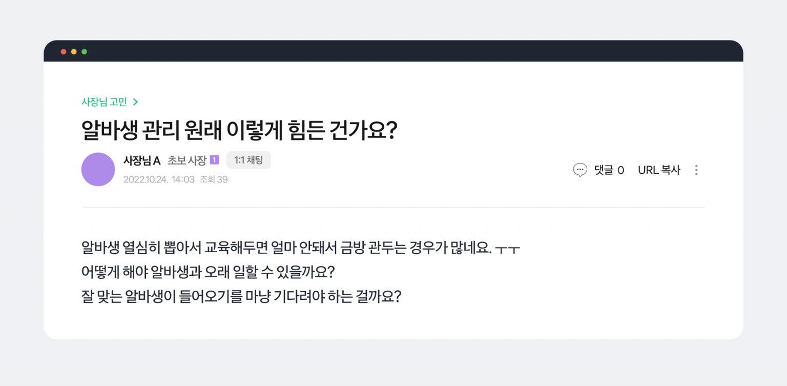 사업을 하다 보면 어디서나 ‘인사가 만사’라는데 직원 관리는 항상 쉽지가 않아요. 공들여 알바생을 뽑아 교육까지 마쳤는데, 얼마 안 돼 일을 그만둔다고 하면 그만큼 힘 빠지는 일이 없죠. 언제 또 새 알바생을 구하나 싶고요. 그래서 사장님 커뮤니티에서는 이런 고민 글을 자주 볼 수 있는데요.