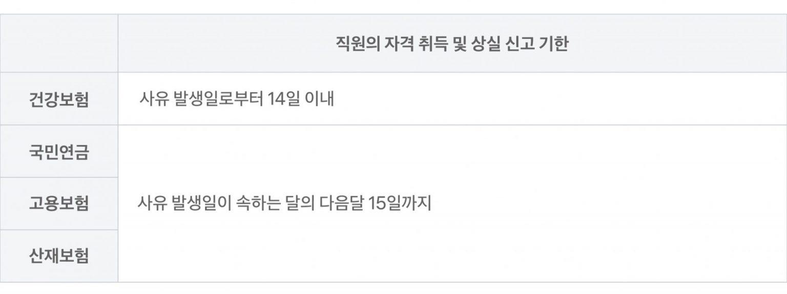 - 직원을 새로 직원을 고용하거나 직원이 퇴사할 때마다 기한 내에 4대보험 자격 취득 및 상실 신고를 해야 해요.