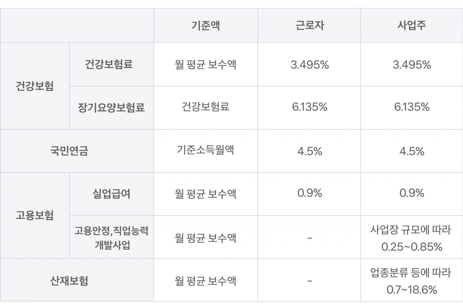보험료는 각 4대보험의 보험료율에 따라 정해져요. 고용보험, 산재보험은 사업장 규모나 업종분류에 따라 보험료율이 다르기도 하고, 계산이 쉽지는 않은데요. 미리 확인해 보고 싶다면 4대사회보험 정보연계센터에서 제공하는 4대사회보험료 모의계산기를 이용해 보세요.