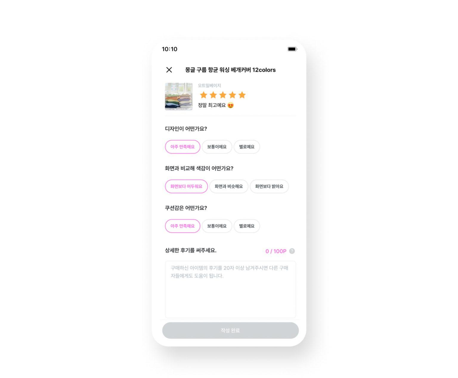 패션 쇼핑몰이라면 보통 핏, 색감, 세탁 후 상태에 대해 많이 리뷰를 작성할 거예요. 회원들이 자주 사용하는 표현을 예시로 알려주거나 버튼만 클릭해도 입력되도록 기능을 추가해 보세요. 리뷰 작성에 부담을 덜 느껴 리뷰를 많이 쓰게 될 수 있어요.