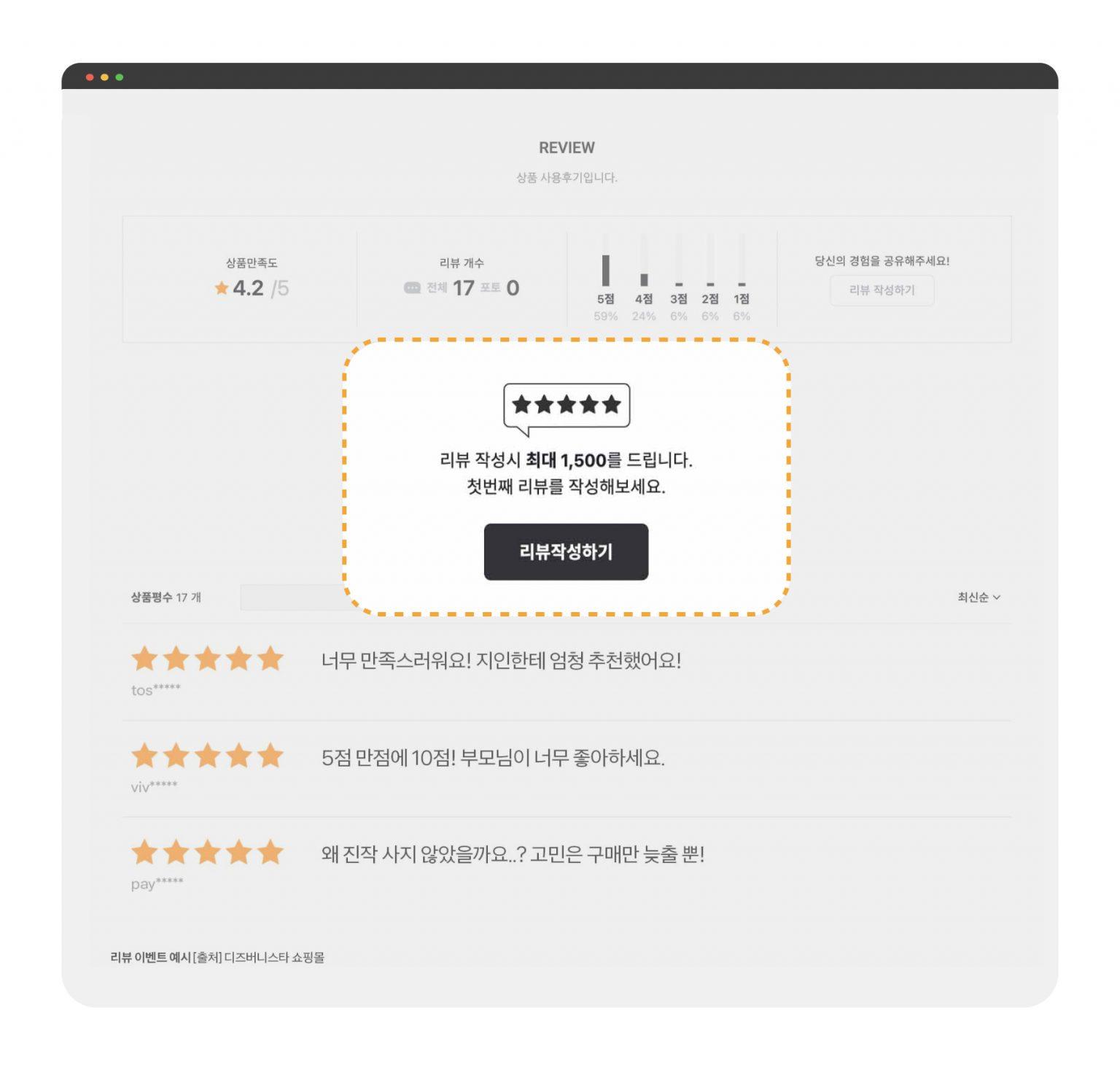 리뷰 작성 시 쇼핑몰에서 사용할 수 있는 포인트를 제공하거나 특정 제품 할인을 하는 등의 이벤트를 진행해볼 수도 있어요.
