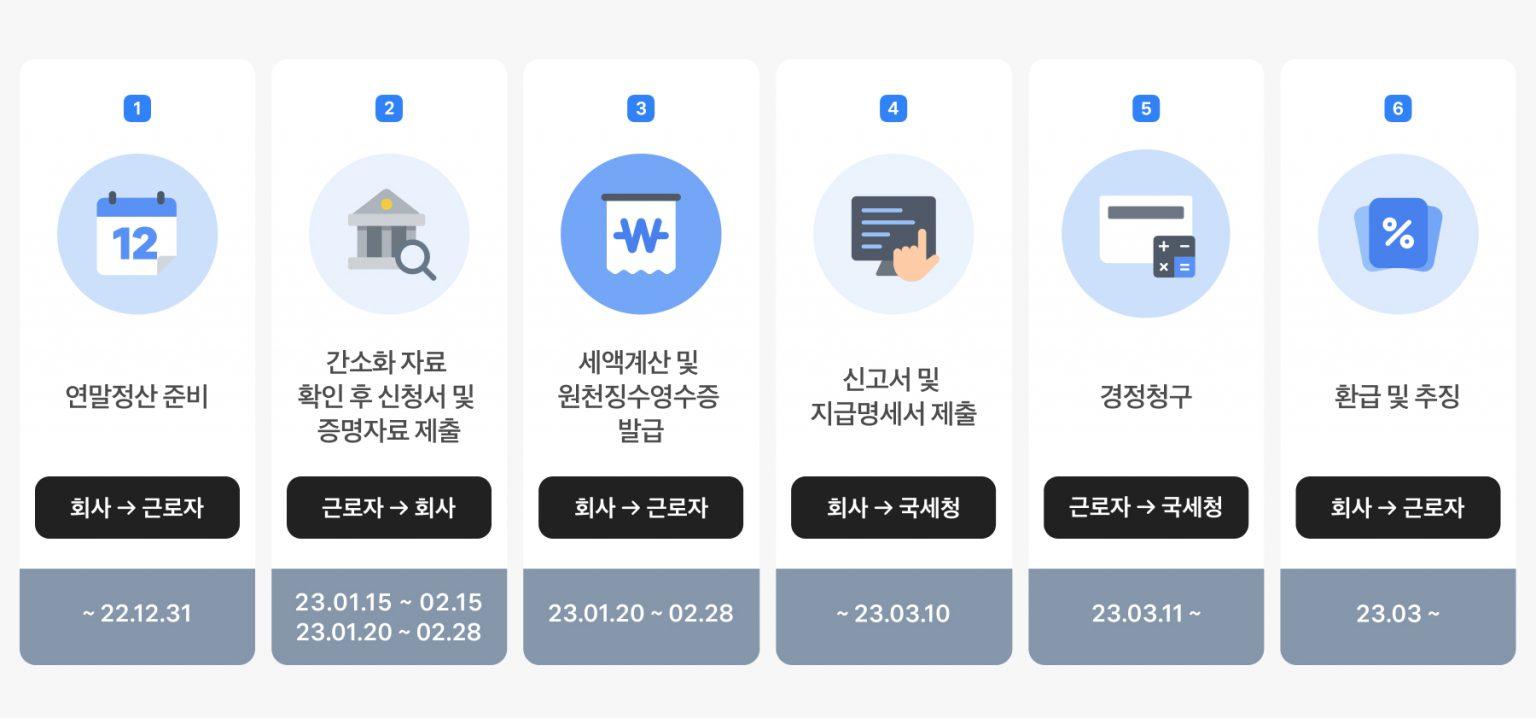 앞선 절차를 완료했다면 회사는 홈택스나 세무서를 통해 원천징수이행 상황신고서와 근로소득 지급명세서를 제출해야 해요. 이때 환급이 발생한다면 연말정산 환급도 함께 신청해요.
