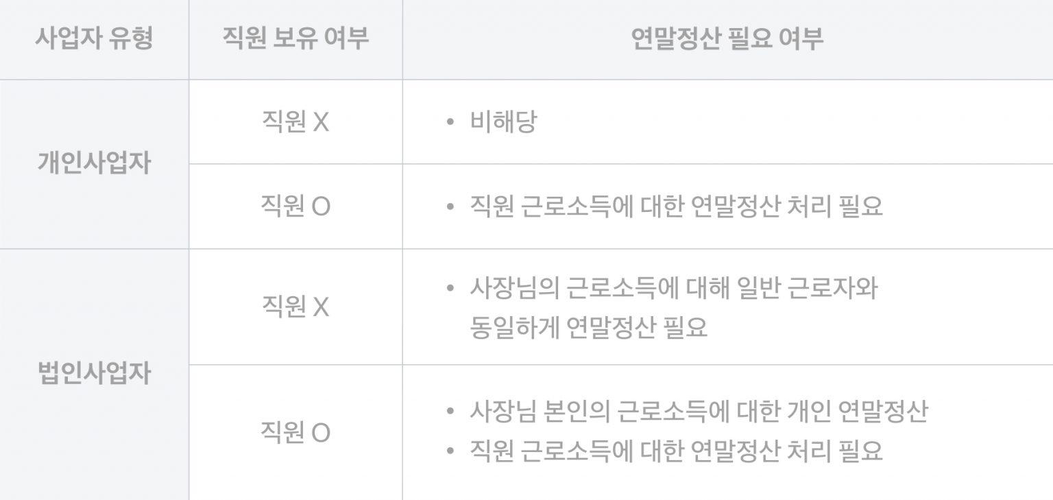 - 직원을 고용한 개인사업자 또는 근로소득이 있는 법인사업자의 경우 연말정산 대상자예요.