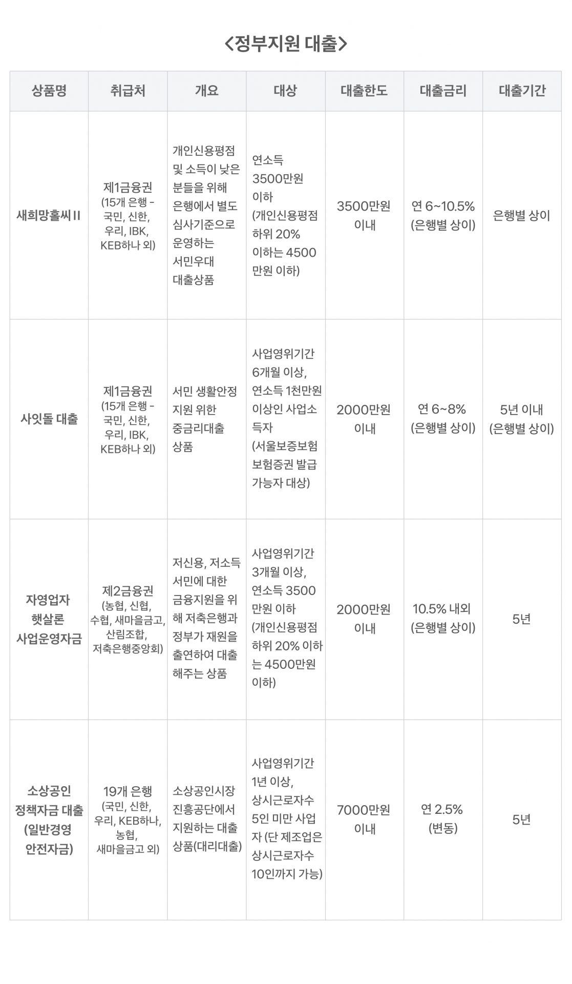 출처: 서민금융진흥원, 소상공인시장진흥공단, 저축은행중앙회 *상품별 정확한 세부 조건은 서민금융진흥원 및 각 취급처를 통해 꼭 확인해 주세요.