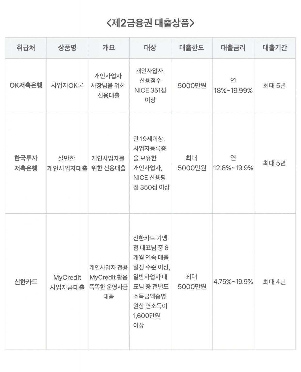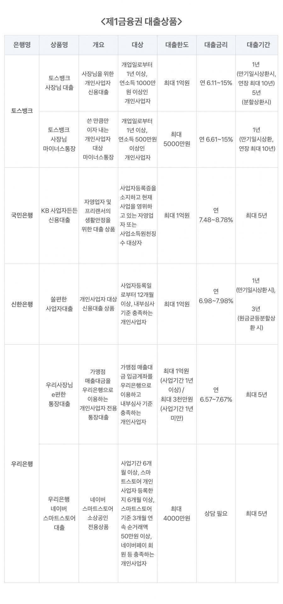 아래 표에서 제1, 2금융권의 개인사업자 신용대출 상품을 잘 비교해 보세요. 은행마다 다양한 대출 상품이 있으니 각 은행 홈페이지 및 영업점을 통해 적합한 상품을 찾아보세요.