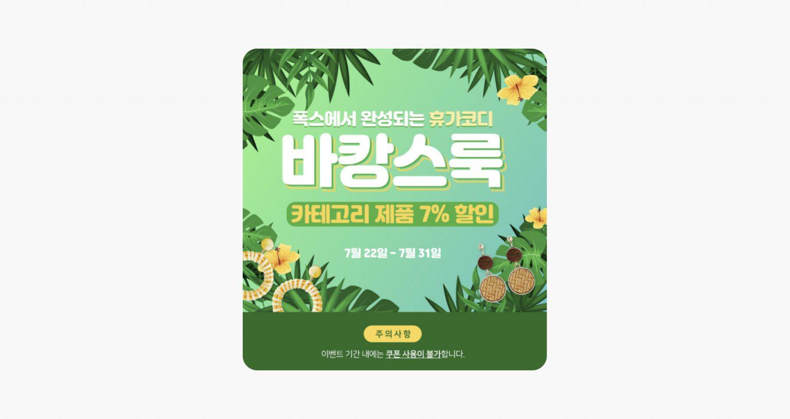 ✅ 프로모션 이름이나 컨셉이 도저히 떠오르지 않을 땐, 해당 계절, 월의 발음이나 표기를 활용하는 것도 좋아요. 예를 들어 6월에 더위 대비 용품 판매를 위한 프로모션을 진행한다고 가정할게요. 6월의 영어 표기인 June (준)을 활용해 ‘6월을 June비하는 더위 대비 기획전’ 라는 식으로 네이밍을 할 수 있어요.