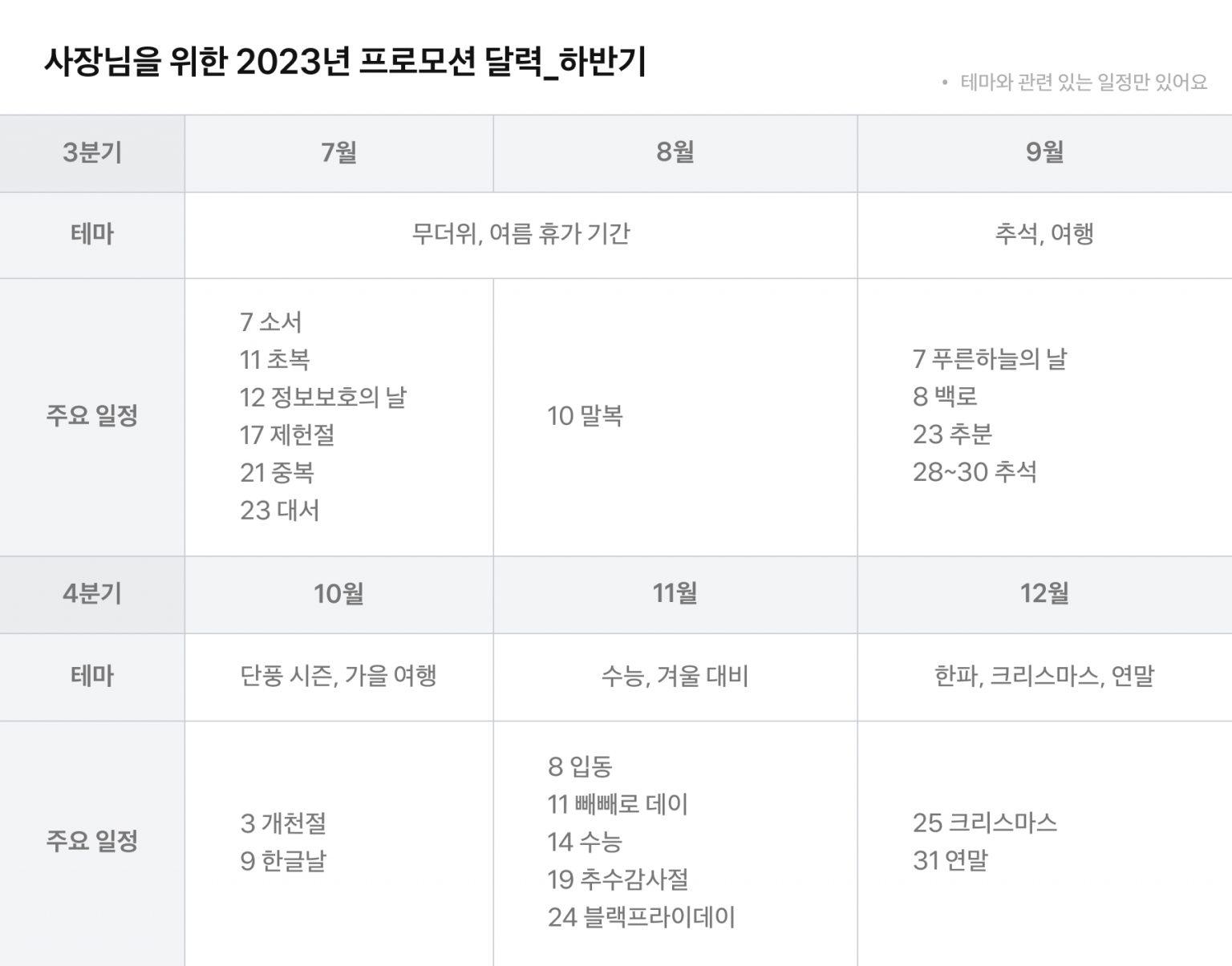 끝으로 상하반기로 나뉘어 있던 달력을 한눈에 볼 수 있도록 합친 형태도 보여드릴게요. 캡쳐해두고서 다음 달 프로모션에 대한 아이디어를 얻으시길 바라요.