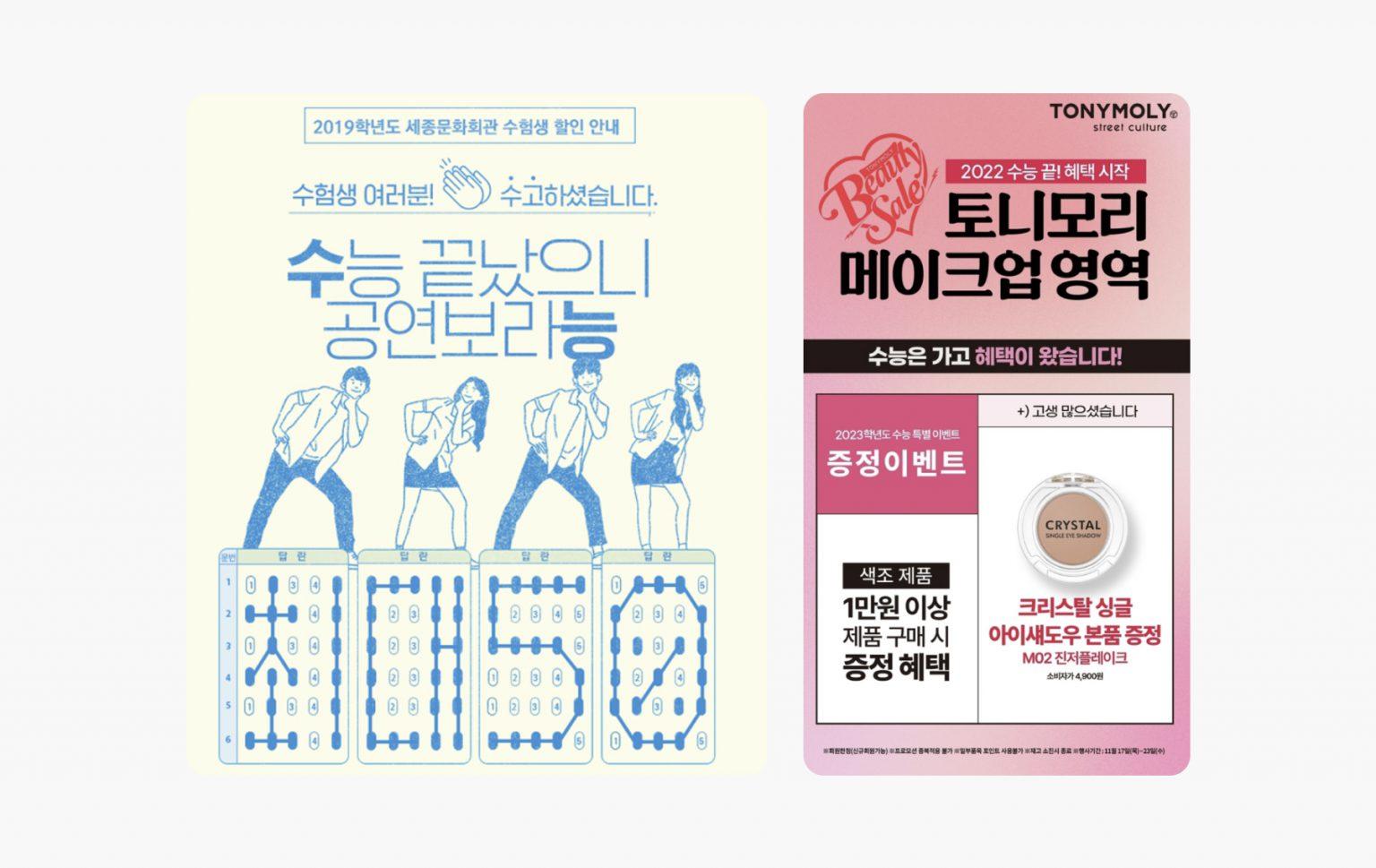수능 이후에는 ‘수험표 인증 이벤트’를 많이들 해요. 요식업, 연극이나 뮤지컬 등 공연계, 미용, 온라인 의류 쇼핑몰과 같은 패션 업계 등에서 관련 프로모션을 준비하면 좋아요.