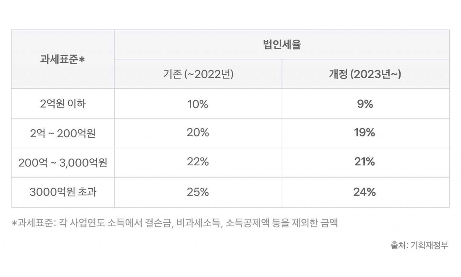 - 과세표준별 법인세율이 1%씩 낮아져 법인사업자의 세금 부담이 적어져요.