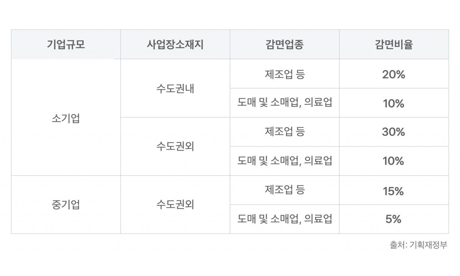 중소기업특별세액감면은 48개 업종에 대해 소득세와 법인세를 5~30% 감면해주는 제도인데요. 코로나19로 인한 중소기업 경영회복 지원을 위해 제도 적용 기한을 3년 늘려 2025년까지로 연장했어요. 소재지, 업종, 규모별 세액 감면 비율은 아래 표를 확인해 주세요.