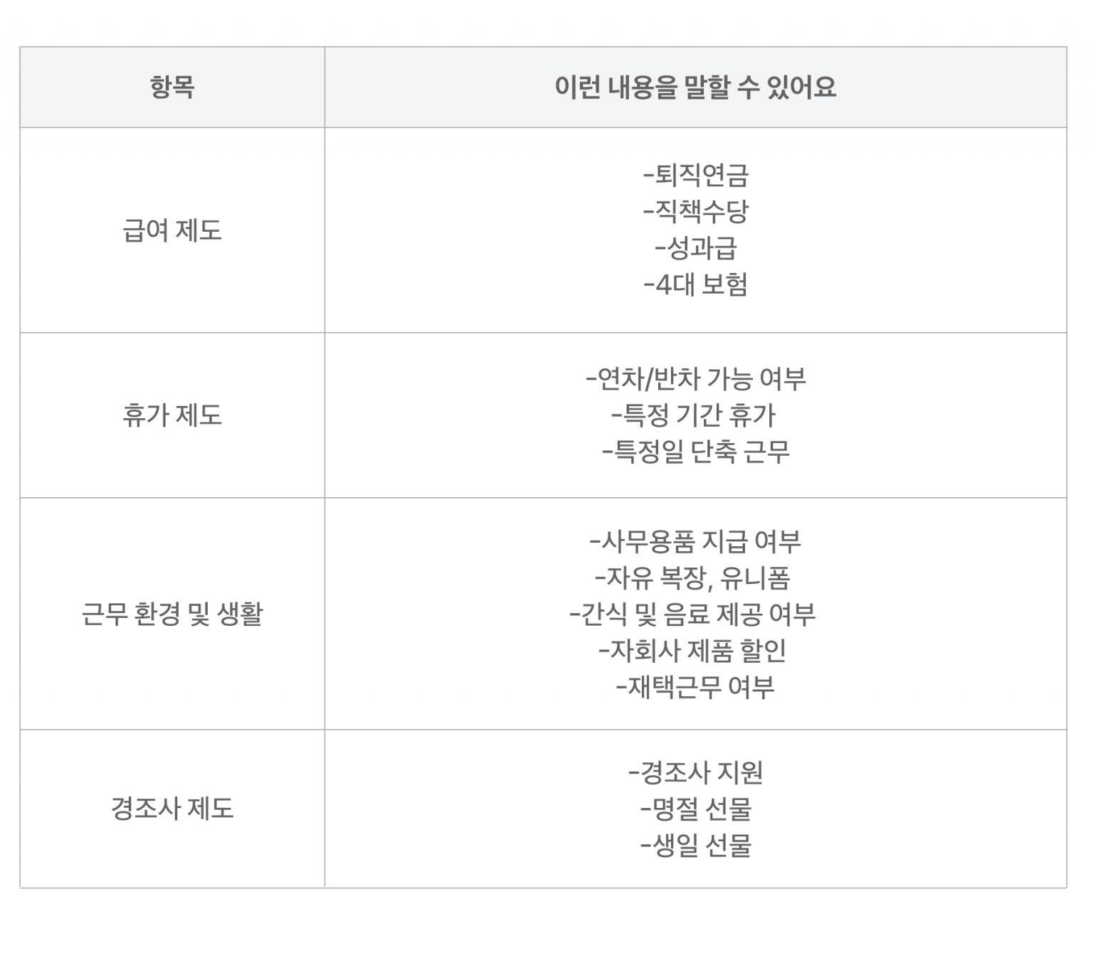 아래는 여러 회사에서 채용공고에 기재한 복리후생을 표로 정리한 내용이에요. 이를 보며 넣을 만한 내용이 있는지 체크해 보세요.