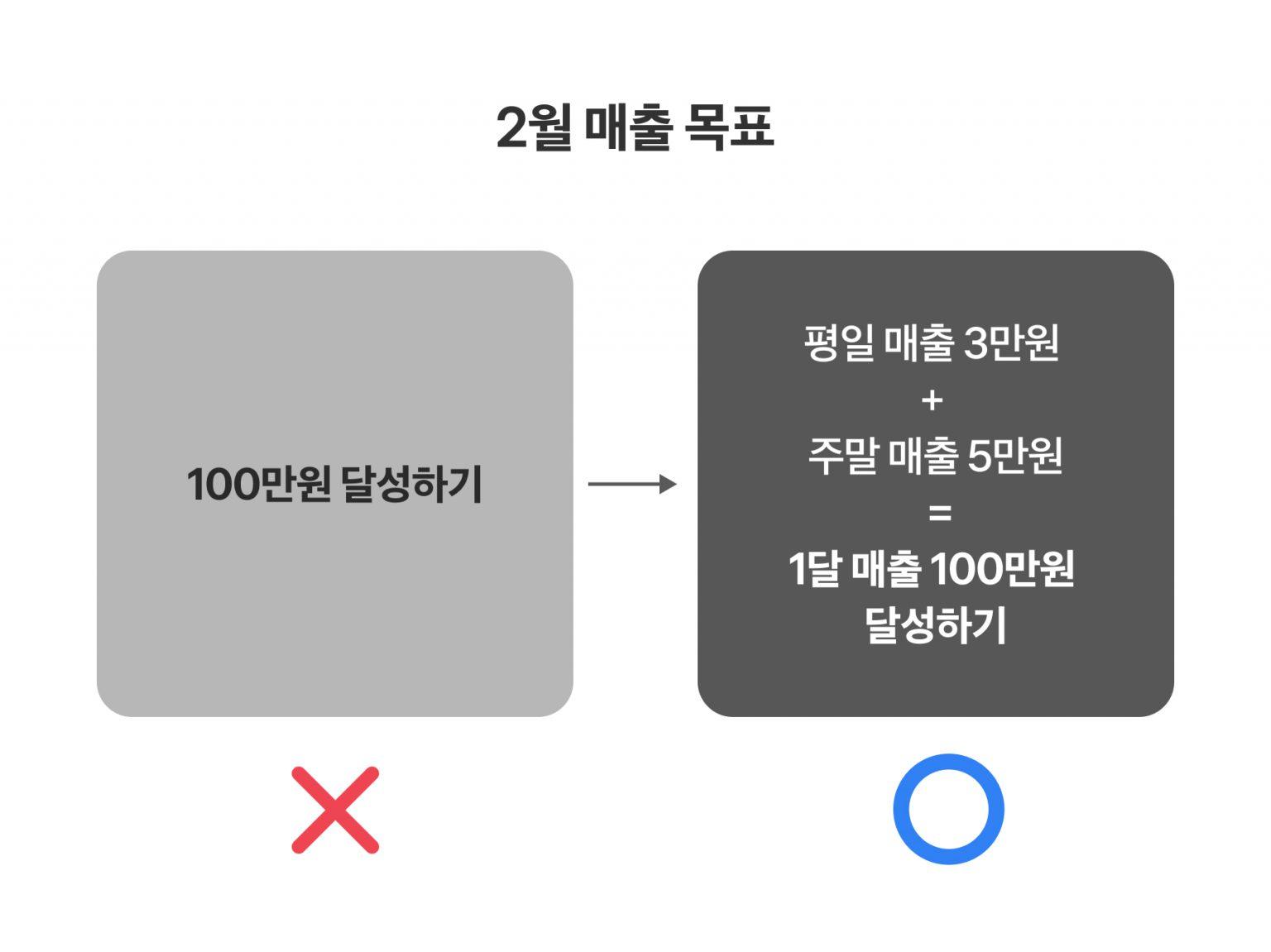 예를 들어 ‘한 달 매출 100만원 달성하기’와 같은 추상적인 목표가 아니라, ‘한 달 4주 기준 평일 매출 3만원, 주말 매출 5만원으로 총 100만원 달성하기’와 같이 구체적인 목표를 정해 보세요.