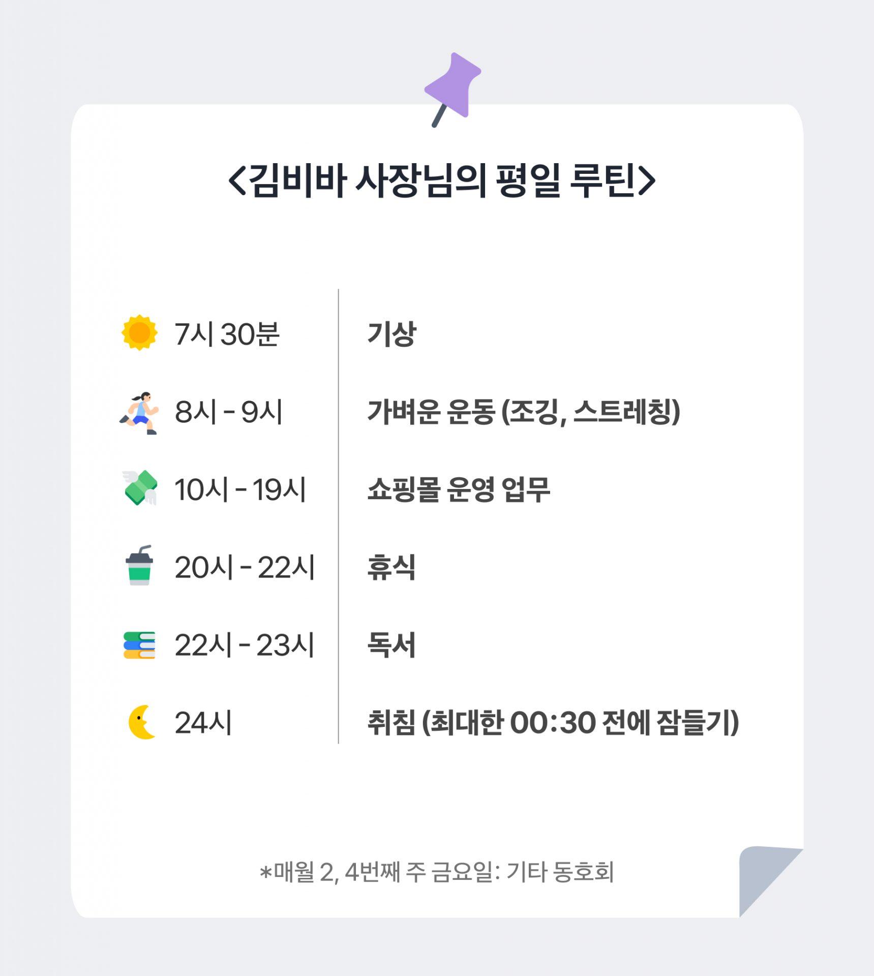이렇게 해야 무기력해지지 않고 규칙적인 매일을 보내기가 더 쉬운데요. 또 운동과 같은 다른 활동에 집중하는 시간을 보내며 사업에 대한 생각을 잠시나마 쉴 수 있고요. 정해진 루틴에 따라 하루를 보내면 컨디션 관리에도 도움이 될 뿐만 아니라, 더 나아가 좋은 컨디션으로 일에 더욱 집중하며 사업에 대한 열정을 높이는 계기가 될 수 있어요.