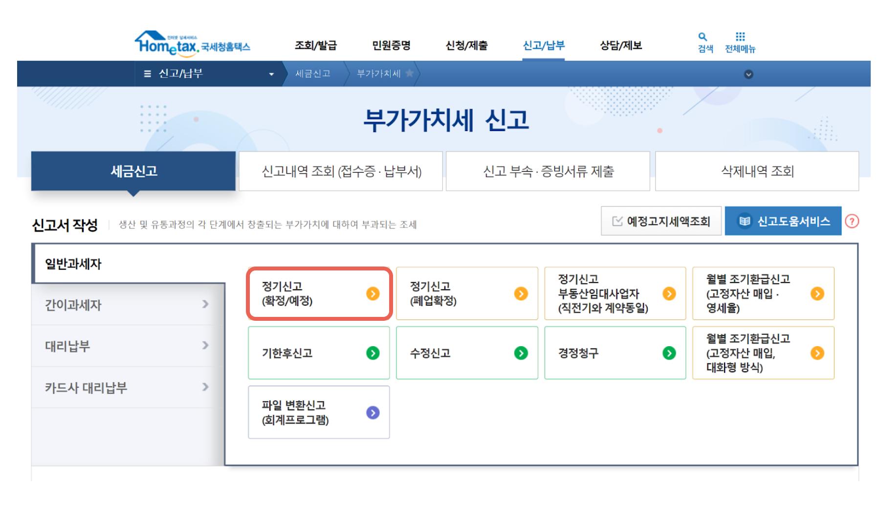 step 1. 홈택스 > 신고/납부 > 부가가치세 > 일반과세자 – 정기신고(확정/예정) 선택