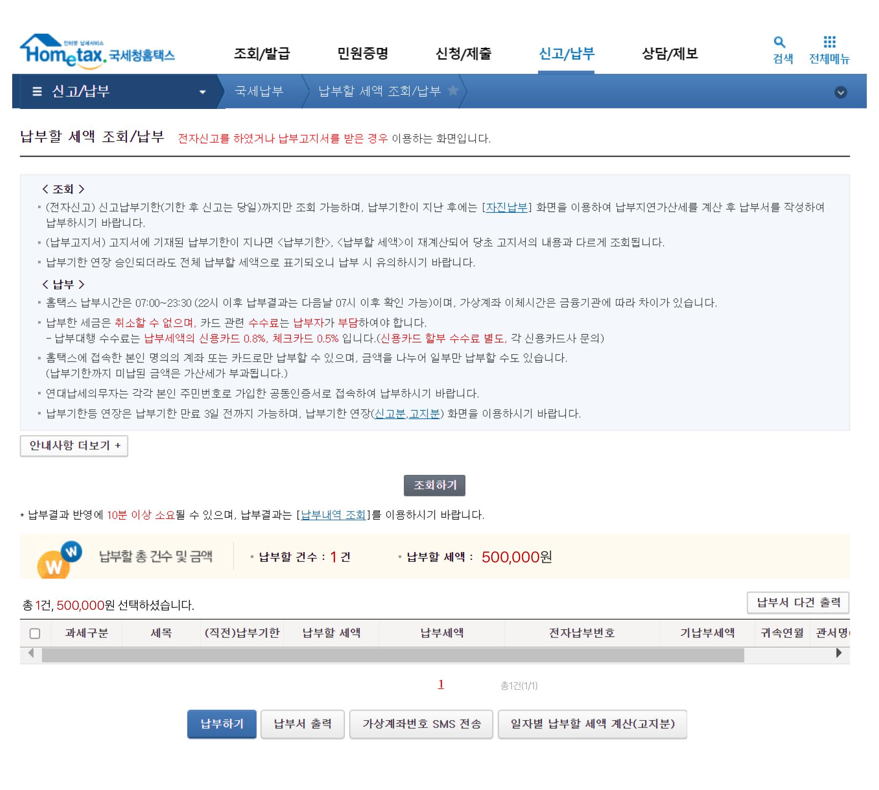 [신고/납부] > 국세납부 > 납부할 세액 조회/납부 > 납부하기
