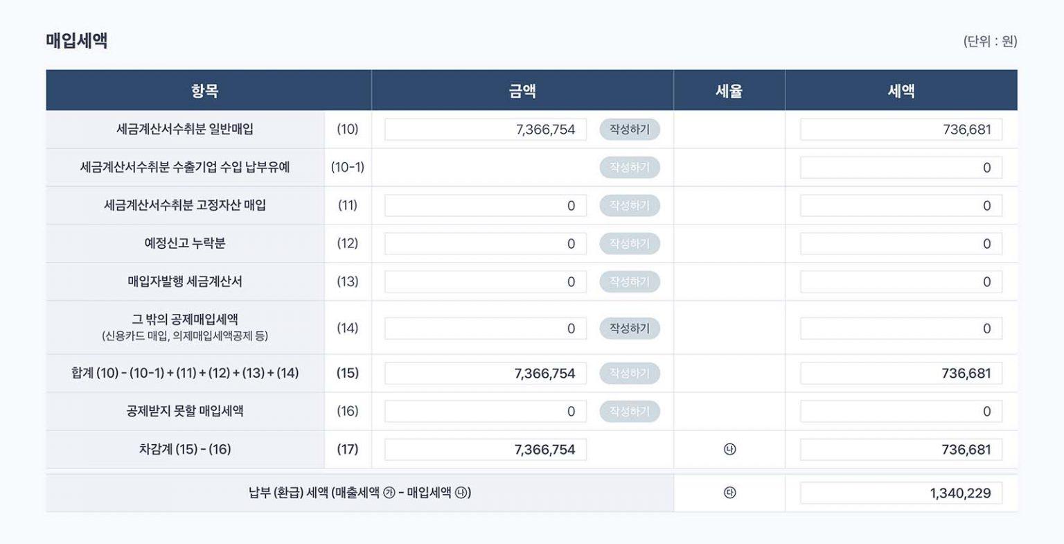 적격증빙 자료를 바탕으로 매입내역을 입력하면 되는데요. 세금계산서를 받은 매입은 ‘세금계산서수취분일반매입’으로, 이외에 카드 결제 또는 현금영수증을 수취한 경우 ‘그 밖의 공제매입세액’으로 집계해 주세요.