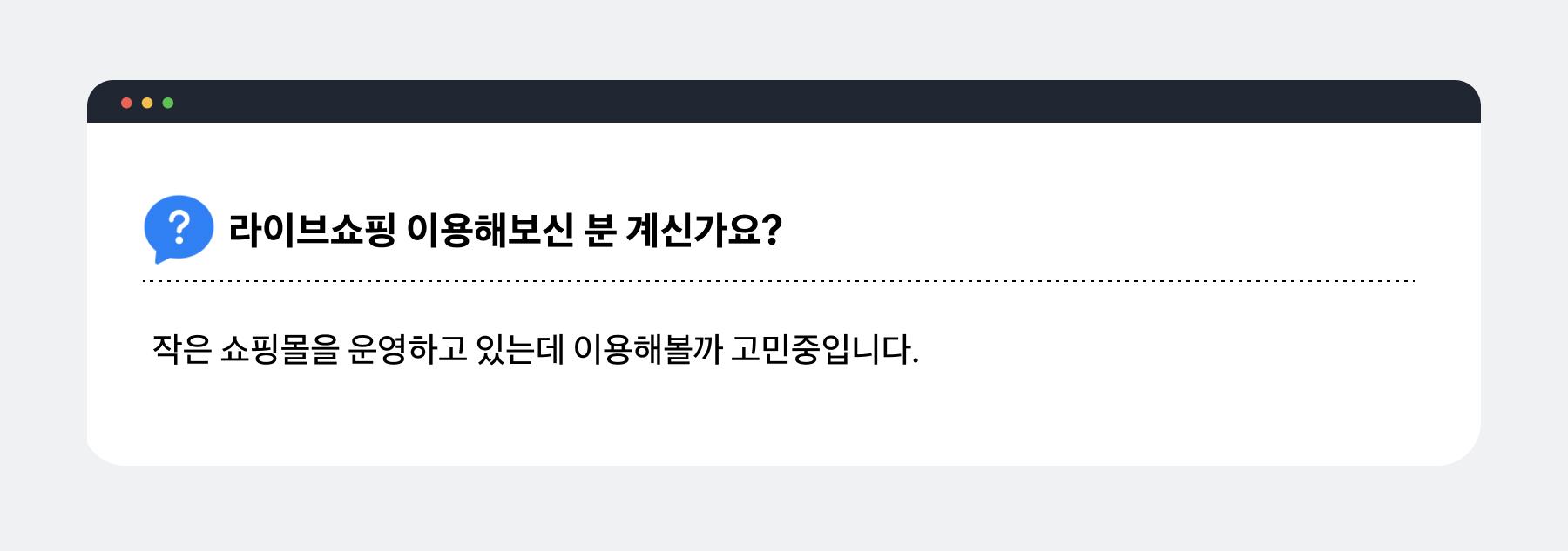 본격적으로 쇼핑라이브 이용 방법을 알아보기 앞서, 사장님들이 가장 궁금해 하는 질문과 답변 5가지를 알려드려요.